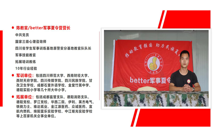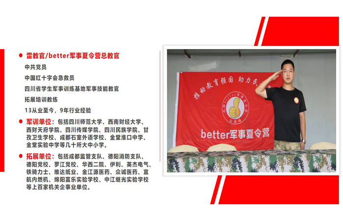 成都better军事夏令营,坚持教育与社会实践相结合,致力于打造“学生开心成长、家长放心交付、社会满意认可”的营地教育,我们通过严格考核、层层选拔,培养了一支素质过硬、有责任心、理论扎实、实践经验丰富的多元化师资队伍,其中包括:国家三级心理咨询师、部队退伍老兵、优秀师范生、警校毕业生等。better军事夏令营,历经6年沉淀,打造出一套独特的课程体系,我们以军事主题为背景,以“阳刚之气”为重点内容,以“适应社会、创新发展”为培养目标,以“军事训练、拓展活动、团辅+1对1”等多种形式,旨在让孩子们在“安全、快乐、有序”的氛围中,收获适应未来社会的八大能力: